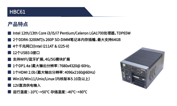支持Intel 12th/13th Core i3/i5/i7 Pentium/celeron LGA1700处理器,TDP65W;支持WIFI/蓝牙扩展,4G/5G模块扩展;